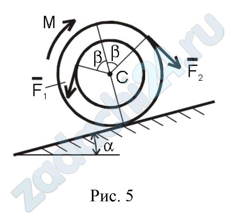 Барабан радиуса R весом P имеет проточку (как у катушки) радиуса r = 0,5R (рис.4.1, табл. Д-4). К концам намотанных на барабан нитей приложены постоянные силы  и , направления которых определяются углом β. Кроме сил на барабане действует пара с моментом M. При движении, начинающимся из состояния покоя, барабан катится без скольжения по шероховатой наклонной плоскости с углом наклона α так, как показано на рисунках.
