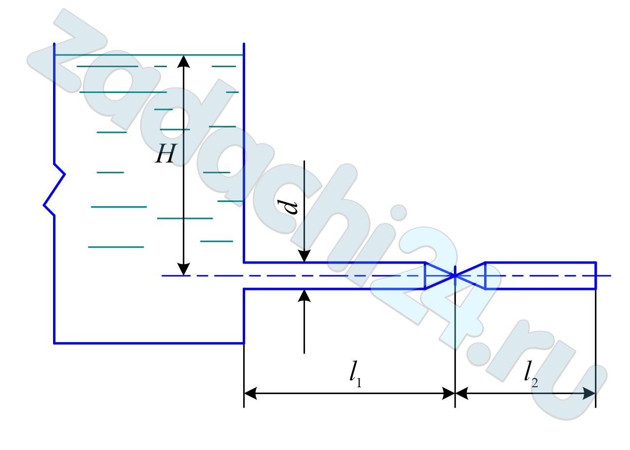 10.335 Определить расход воды из трубопровода если: Н = 5 м, l1 = 50 м; l2= 30 м; ζвх = 0,5; ζвых = 1; ζзад = 2,5; d = 150 мм; Δ = 0,5 мм; v (коэффициент кинематической вязкости) = 1·10-6 м²/с.