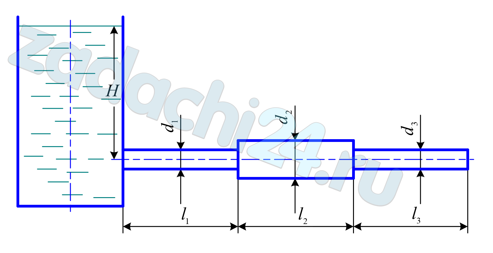 10.339 Из открытого резервуара по трубопроводу (d1, l1 и d2, l2) происходит истечение воды в атмосферу при постоянном напоре H = 4,0 м. Коэффициент сопротивления крана ζк, шероховатость стенок трубы Δ = 0,50 мм.