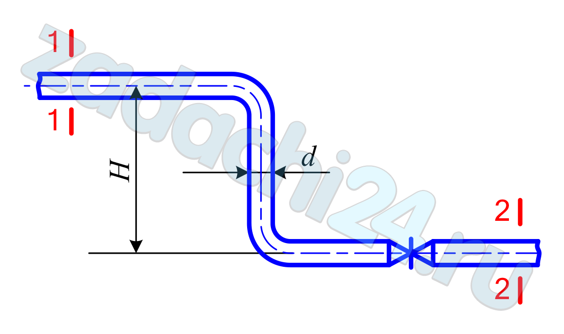 10.328 Определить расход воды из трубопровода и построить пьезометрическую линию, если: Н = 5 м, l1 = 50 м; l2= 45 м; ζвх = 0,5; ζвых = 1; ζзад = 2,5; d = 100 мм; Δ = 0,5 мм; v (коэффициент кинематической вязкости) = 0,01 см²/с.