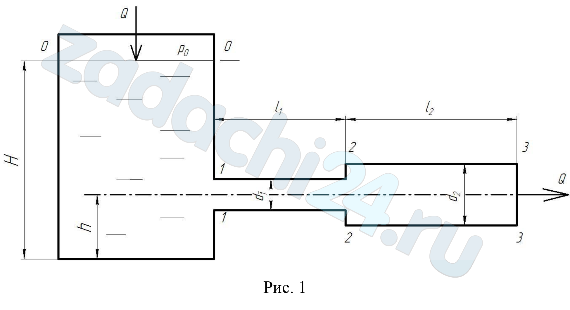 10.322 Вода по трубе 1 подается в открытый бак и вытекает по трубе 2. Во избежание переливания воды через край бака устроена вертикальная сливная труба 3 длиной l = 2,5 м диаметром d = 25 мм. Определить минимальный диаметр трубы 3, при известном соотношении l/d = 100, из условия чтобы при Q1 = Q = 4 л/c и перекрытой трубе 2 (Q2 = 0) вода не переливалась через край бака. При расчете величиной а пренебречь (а = 0), режим течения считать турбулентным, учитывая потери на входе в трубу (внезапное сужение), в колене (ζк = 0,5) и на трение по длине трубы (λт = 0,03).