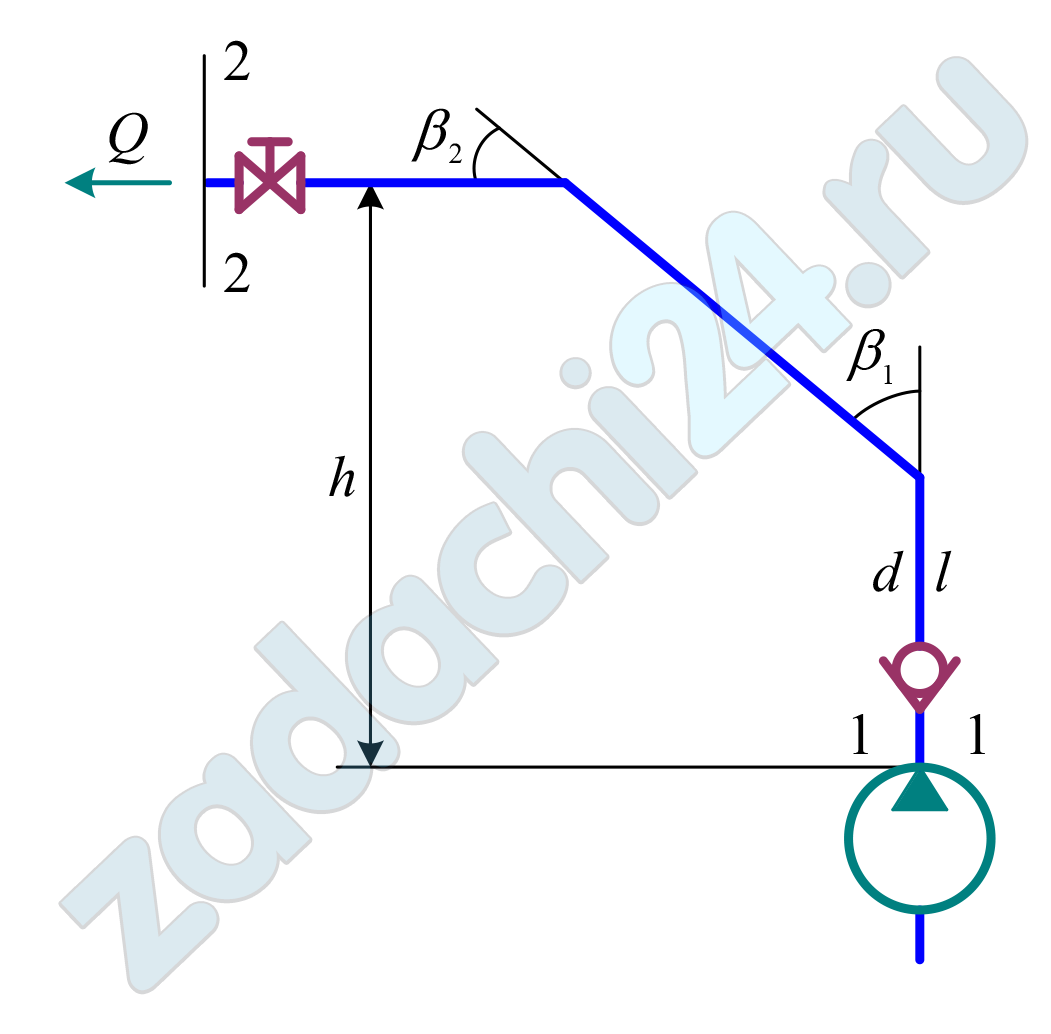 10.329 Насос (рис. 6.4) подает воду на h = 8 м по стальному не новому трубопроводу диаметром d = 50 мм и длиной l = 20 м, на котором имеются обратный клапан, вентиль с прямым затвором, два резких поворота на углы β1 = 60º и β2 = 30º. Расход Q = 2,5 л/с, давление в конце трубопровода р2 = 150 кПа, температура воды – 15 ºС. Определить давление р1 в начале трубопровода (на выходе из насоса).