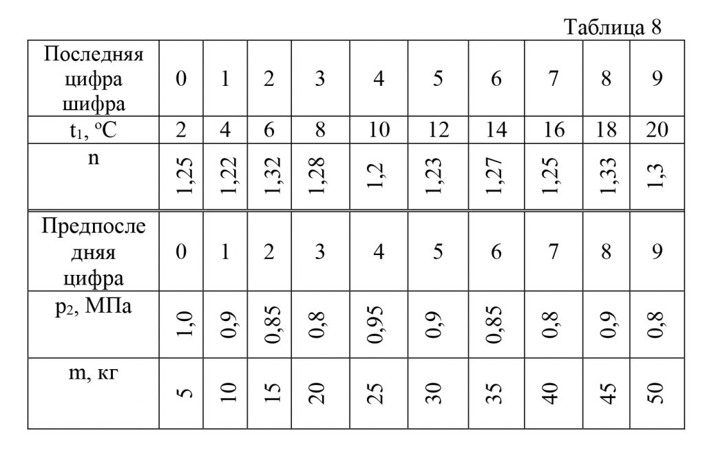 | Род газа | t1, ºC | р1, МПа | М, кг | р2пол, МПа | V2, м3 |