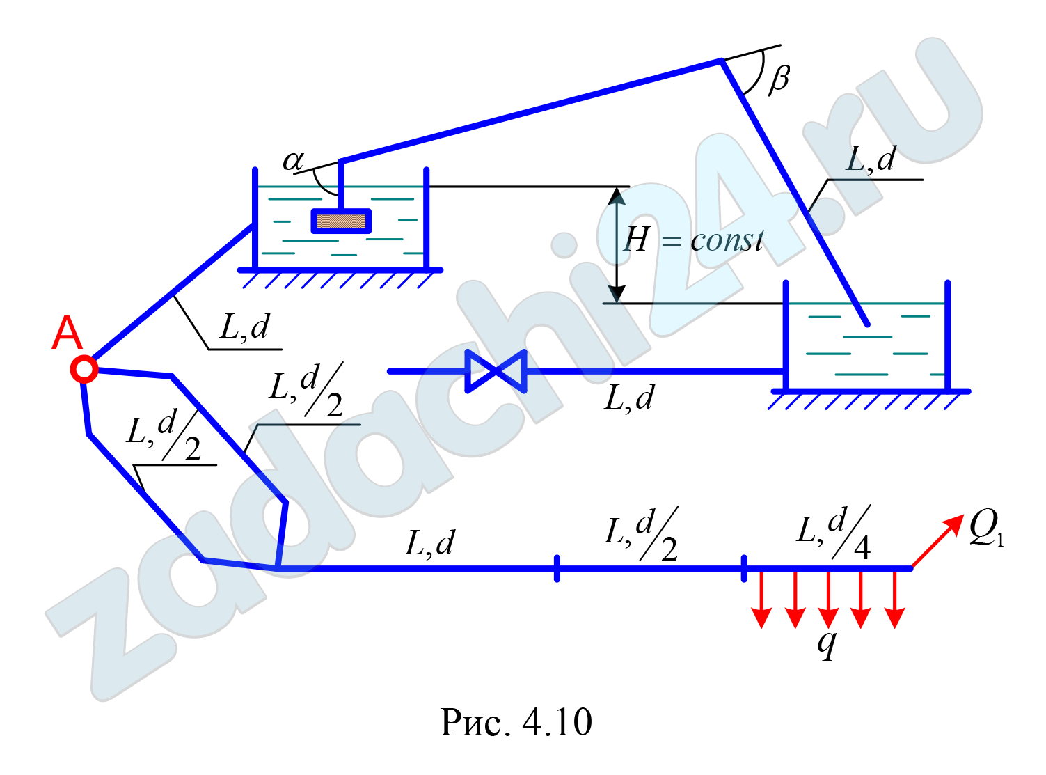 11.190 Из источника А вода подается по чугунному трубопроводу в водоем со скоростью υо, где поддерживается уровень, который сообщен с другим водоемом посредством сифона. Чугунный сифон имеет диаметр d и углы поворота α и β. От второго водоема отходит чугунный трубопровод диаметром d толщиной стенки е, в котором перед закрытием задвижки создается давление ро. Другой участок системы водоснабжения имеет трубопроводы с параллельным и последовательным соединениями. Путевой объемный расход в конце последовательного участка составляет q.