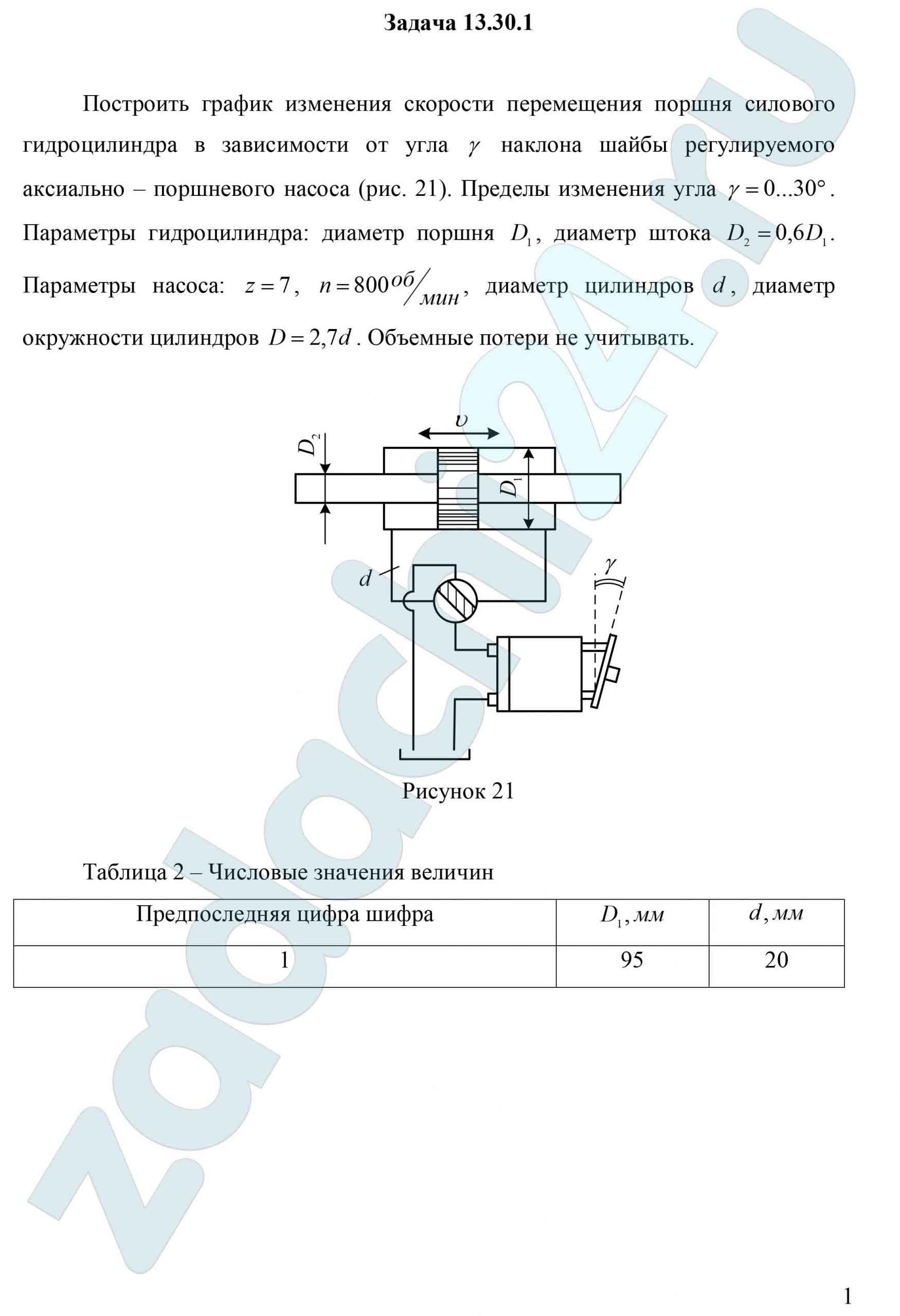 13.30 Построить график изменения скорости перемещения поршня силового гидроцилиндра в зависимости от угла γ наклона шайбы регулируемого аксиально – поршневого насоса (рис. 21). Пределы изменения угла γ=0…30º. Параметры гидроцилиндра: диаметр поршня D1, диаметр штока D2=0,6D1. Параметры насоса: z=7, n=800 об/мин, диаметр цилиндров d, диаметр окружности цилиндров D=2,7d. Объемные потери не учитывать.