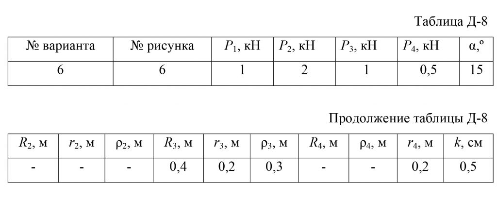 Механическая система, состоящая из груза 1 весом Р1, блоков 2 и 3 весом Р2 и Р3 соответственно и сплошного катка 4 весом Р4, движется под действием сил тяжести. Радиус инерции блоков 2 и 3 — ρ2 и ρ3. Если в таблице радиус инерции блока не указан, блок следует считать полым цилиндром. Каток 4 движется по рельсу, наклоненному к горизонту под углом α без скольжения. Коэффициент трения качения k. Трением в осях пренебречь, проскальзывание невесомых нерастяжимых нитей отсутствует. С помощью общего уравнения динамики определить ускорение оси катка. Схемы механизмов приведены на рис. 8.1, 8.2, данные – в таблице Д-8.1.