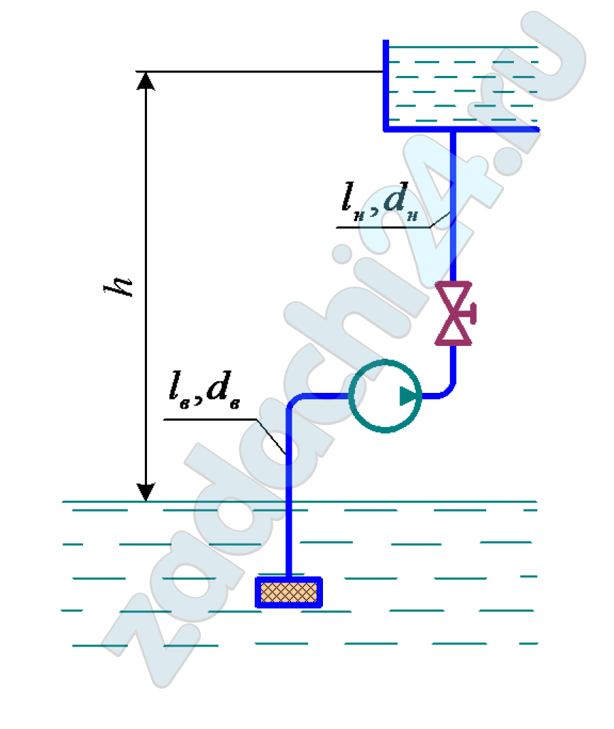 15.77 Центробежный насос подает воду в бак на высоту h по трубопроводам диаметром dв, dн и длиной lв, lн. Коэффициент гидравлического сопротивления всасывающего трубопровода λв = 0,025, напорного — λн = 0,03.