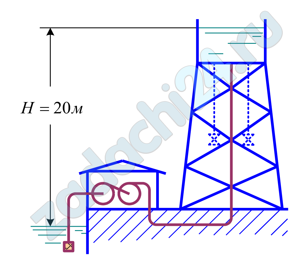 Глубина установки насоса в колодце относительно основания башни H0; высота башни H; высота уровня воды в баке h; длина участка трубопровода от насоса до крана h0; его диаметр d1; коэффициент сопротивления крана ζКР отнесен к диаметру d1; показание манометра рМ; подача насоса Qн. Требуется:
