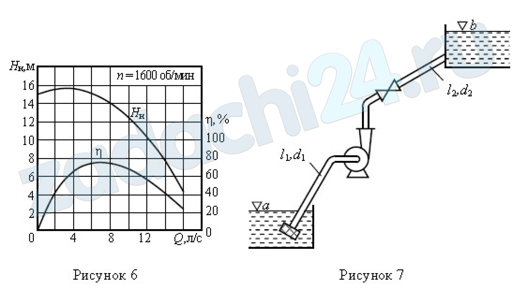 15.82 Центробежный насос с заданной при n = 1600 об/мин характеристикой (рисунок 6) перекачивает воду из резервуара с отметкой ∇а в резервуар с отметкой ∇b по трубопроводам с параметрами l1, d1 (Σζ1, λ1) и l2, d2 (Σζ2, λ2) (рисунок 7).