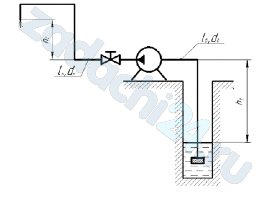 15.83 Центробежный насос откачивает воду из колодца с расходом Q. Установившийся уровень воды в колодце ниже вала насоса на h1. Вакуумметрическая высота на входе в насос Нвак = 7 м. Длина всасывающего трубопровода lв = 5 м, напорного — lн = 3 м, диаметр dн. Выходное сечение напорного трубопровода расположено выше вала насоса на расстояние h2. Коэффициент гидравлического сопротивления трубопроводов λ = 0,03.