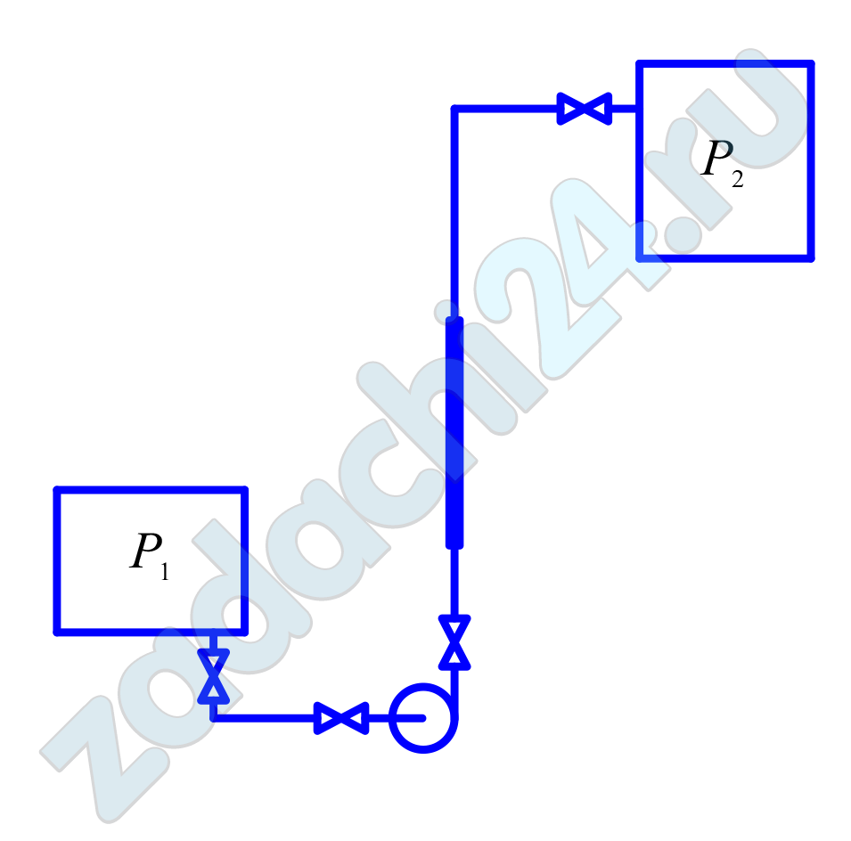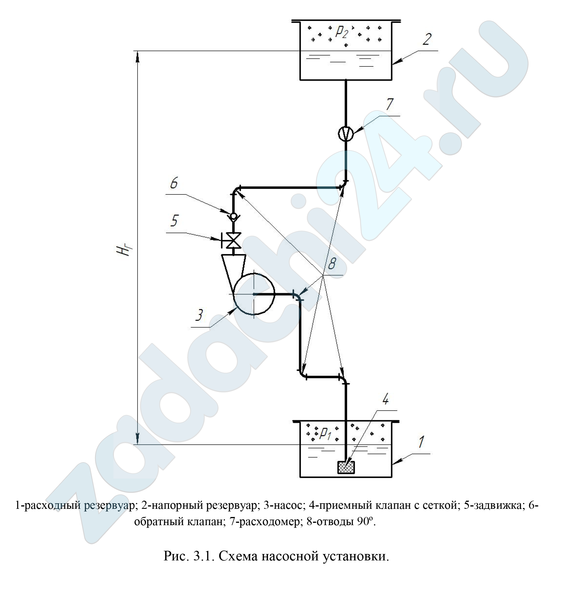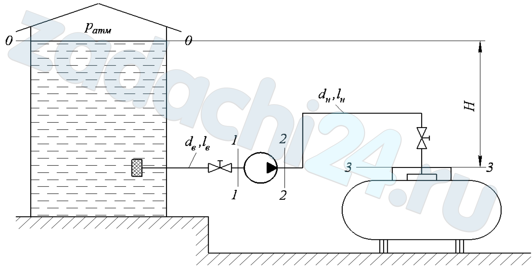 15.88 Подобрать насос для подачи воды из расходного резервуара в напорный резервуар. Геометрическая высота подачи НГ. Абсолютное давление на свободной поверхности жидкости в расходном резервуаре p1, в напорном резервуаре p2. Подача воды Q. Диаметр трубопровода всасывания dвс, длина трубопровода всасывания lвс. Диаметр трубопровода нагнетания dн, длина трубопровода нагнетания lн. Коэффициент гидравлического сопротивления трения трубопроводов всасывания и нагнетания λ принять равным λ = 0,02.