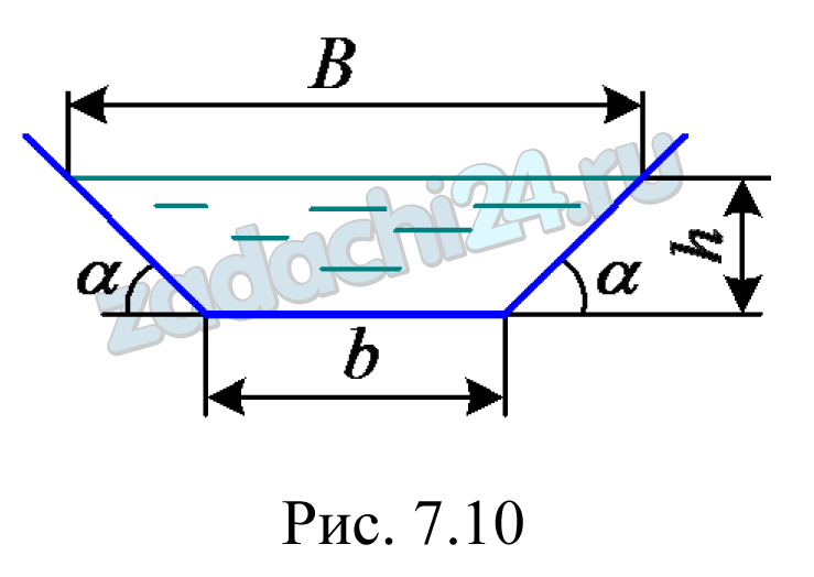 16.4 Жидкость движется в трапецеидальном лотке (трапеция равнобокая) (рис. 7.10) со средней по живому сечению скоростью υ=2,1 м/c. Ширина лотка по дну b=0,4 м, глубина наполнения h=0,1 м, угол наклона боковых стенок лотка к горизонту α=45º. Определить, при какой температуре будет происходить смена режимов движения жидкости. График зависимости кинематического коэффициента вязкости жидкости от температуры показан на рис. 7.5.