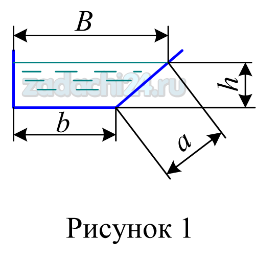 16.1 Жидкость движется в лотке со скоростью V = 0,1 м/c. Глубина наполнения лотка h = 30 см, ширина по верху В = 50 см, ширина по низу b = 20 см. Определить смоченный периметр, площадь живого сечения, гидравлический радиус, расход, режим движения жидкости, если динамический коэффициент вязкости жидкости μ = 0,0015 Па·с, а ее плотность ρ = 1200 кг/м³.