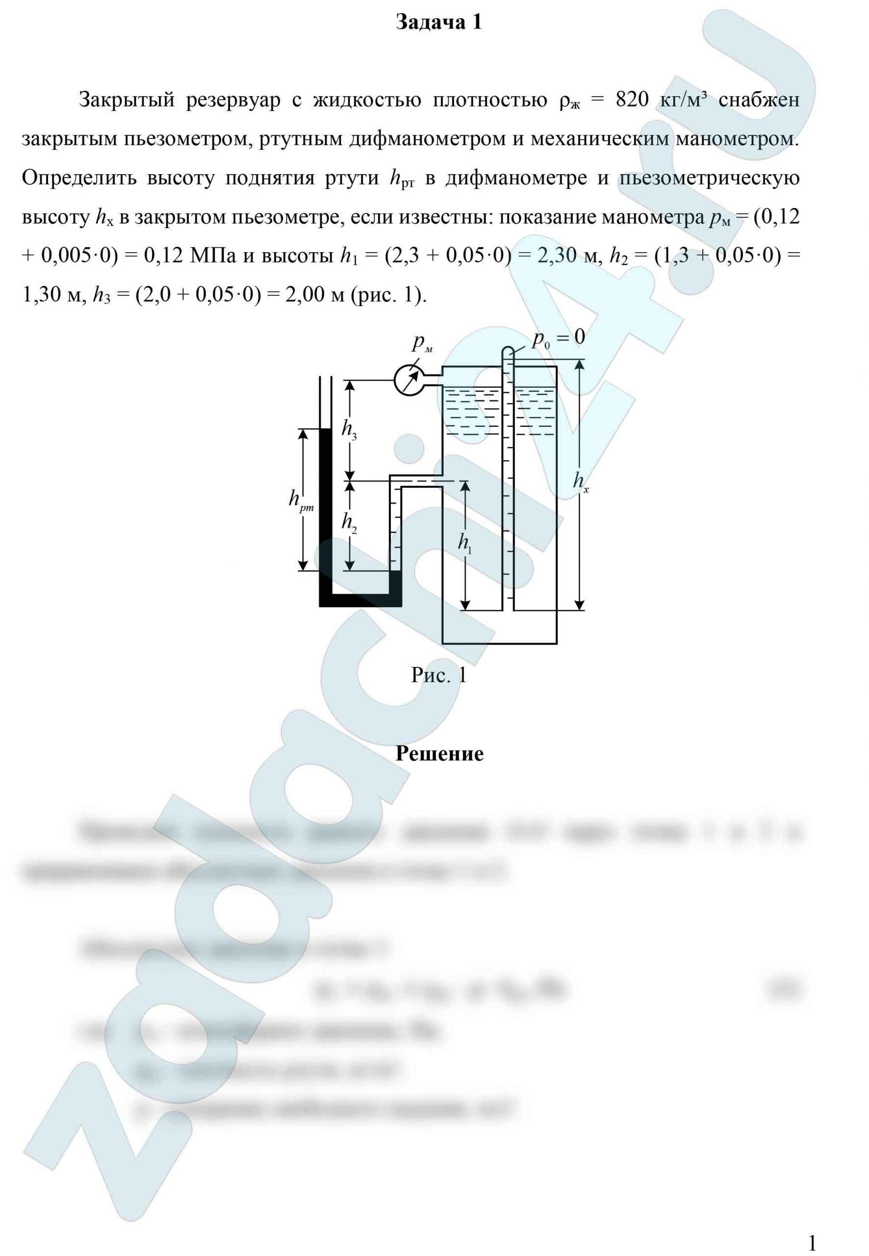 2.471 Закрытый резервуар с жидкостью плотностью ρж = 820 кг/м³ снабжен закрытым пьезометром, ртутным дифманометром и механическим манометром. Определить высоту поднятия ртути hрт в дифманометре и пьезометрическую высоту hx в закрытом пьезометре, если известны: показание манометра рм = (0,12 + 0,005·y) МПа и высоты h1 = (2,3 + 0,05·y) м, h2 = (1,3 + 0,05·z) м, h3 = (2,0 + 0,05·y) (рис. 1).