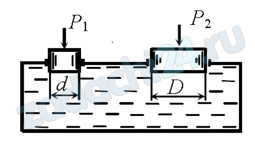 2.503 На поршень А гидравлического пресса диаметром d = 0,05 м действует сила Р1 = 196,2 Н. Определить диаметр поршня D, при котором на него будет действовать усилие Р2 = 5886 Н. Весом поршня пренебречь (см. рис.).