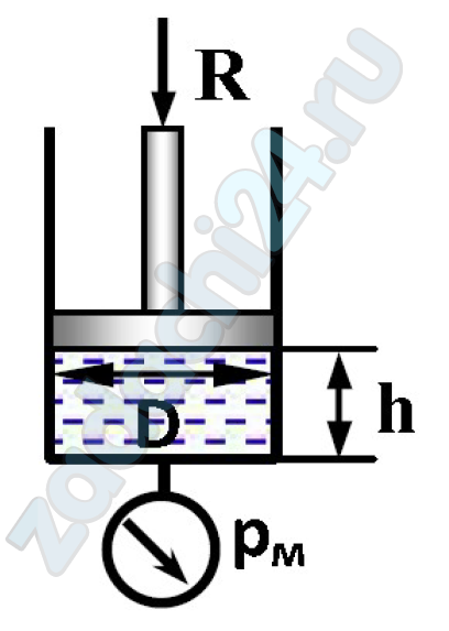 2.525 Определить показание манометра, если поршень диаметром D, действует сила R, уровень жидкости в цилиндре h, а плотность жидкости ρ.