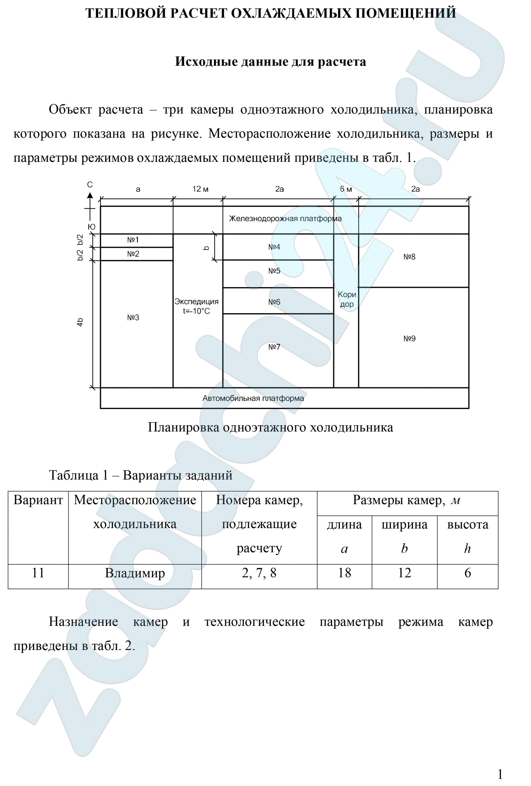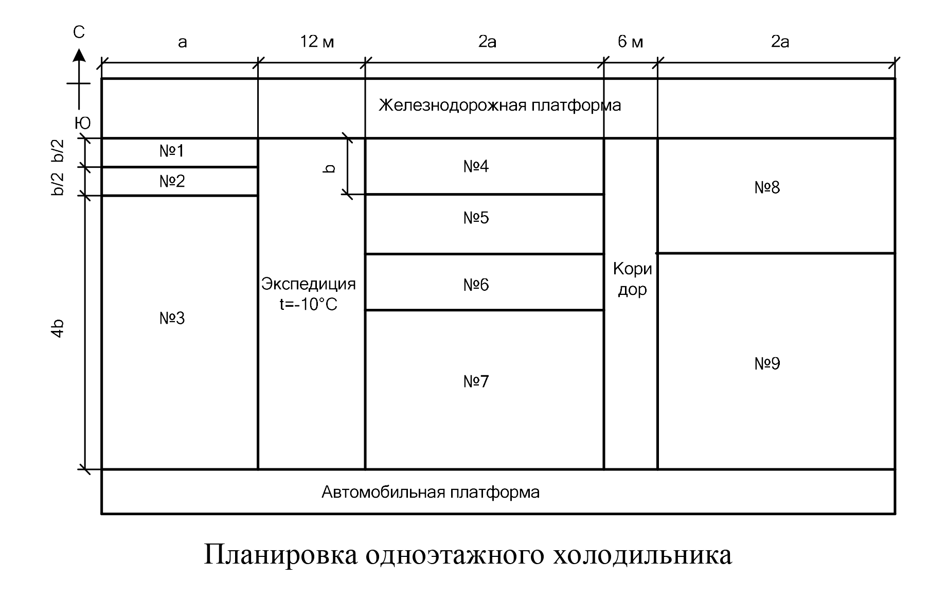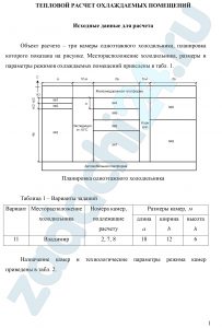 Объект расчета – три камеры одноэтажного холодильника, планировка которого показана на рисунке. Месторасположение холодильника, размеры и параметры режимов охлаждаемых помещений приведены в табл. 1.