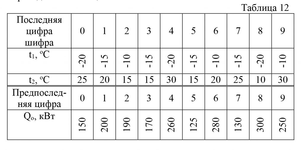 | Вариант | t0, °С | tк, °С | Q, кВт |