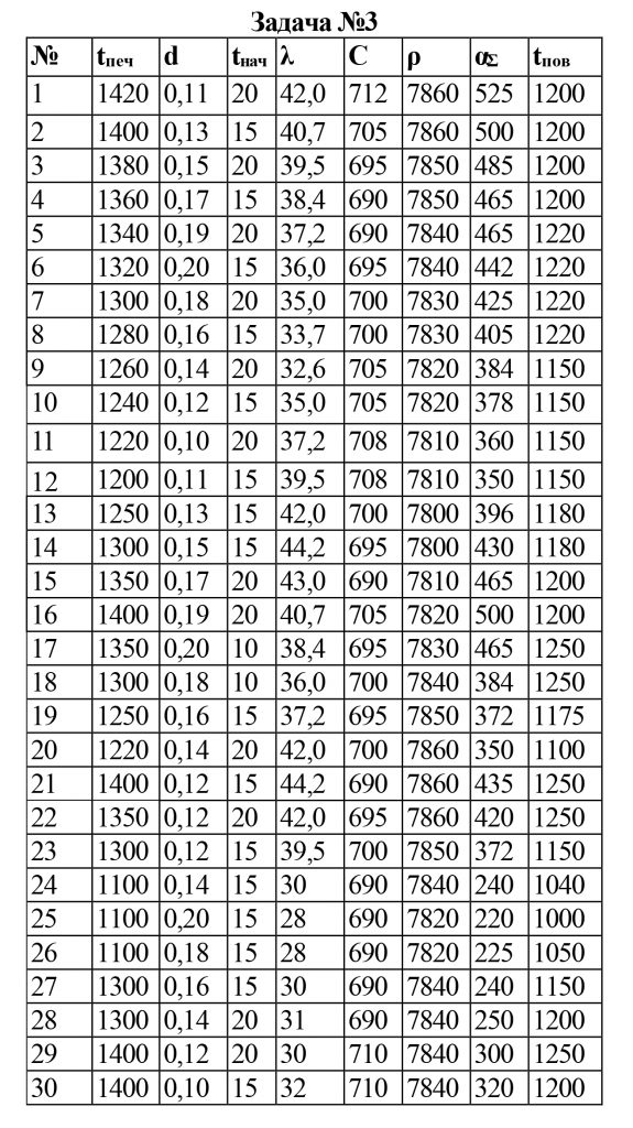 В печь, температура которой tпеч все время поддерживается постоянной, помещают длинный стальной цилиндр диаметром d. В момент загрузки в печь температура металла была равномерна по всему сечению и составляла tнач. Физические свойства стали приняты постоянными, не изменяющимися с температурой: коэффициент теплопроводности λм, теплоемкость см и плотность ρм.