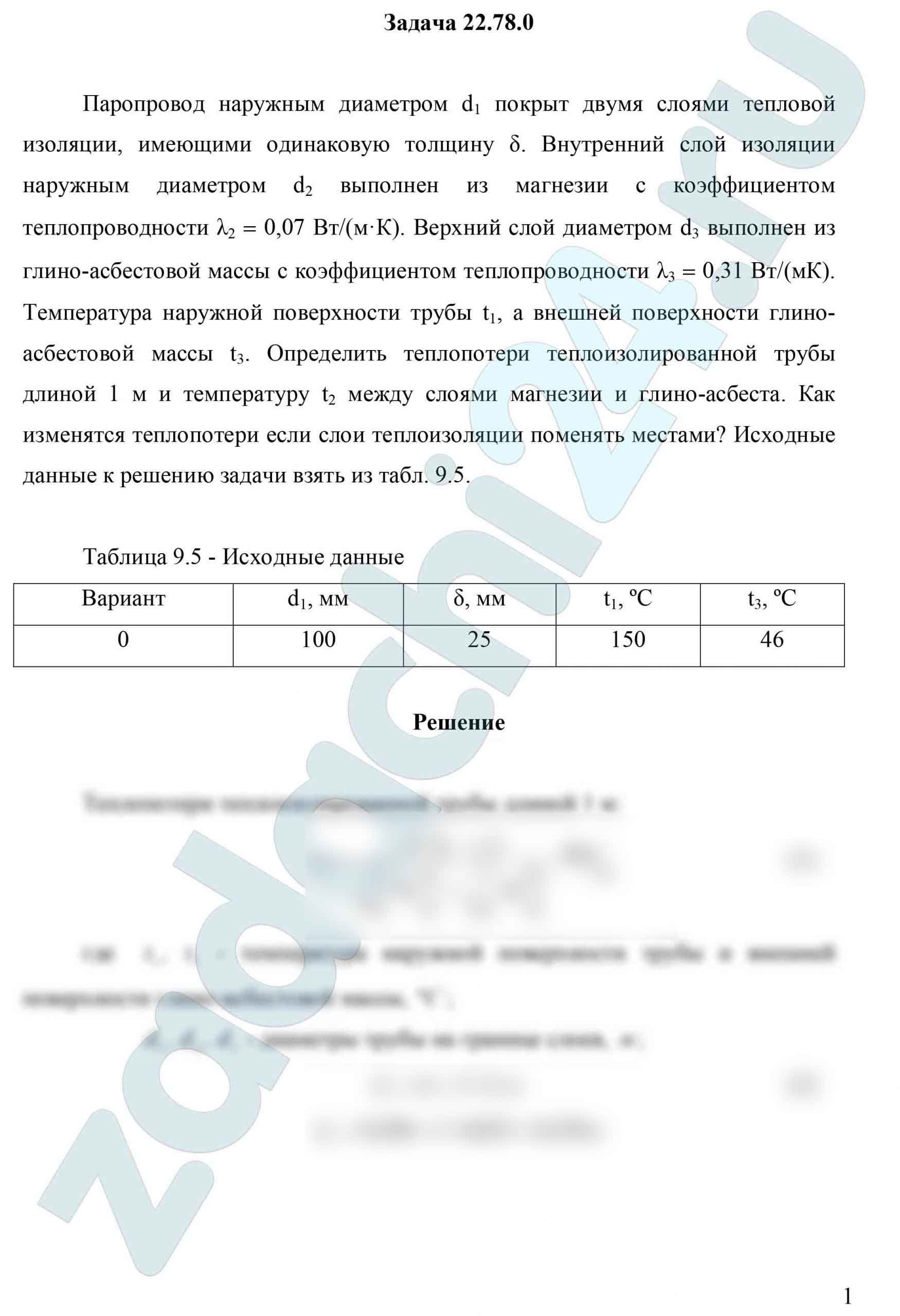 22.78 Паропровод наружным диаметром d1 покрыт двумя слоями тепловой изоляции, имеющими одинаковую толщину δ. Внутренний слой изоляции наружным диаметром d2 выполнен из магнезии с коэффициентом теплопроводности λ2 = 0,07 Вт/(м·К). Верхний слой диаметром d3 выполнен из глино-асбестовой массы с коэффициентом теплопроводности λ3 = 0,31 Вт/(мК). Температура наружной поверхности трубы t1, а внешней поверхности глино-асбестовой массы t3. Определить теплопотери теплоизолированной трубы длиной 1 м и температуру t2 между слоями магнезии и глино-асбеста. Как изменятся теплопотери если слои теплоизоляции поменять местами? Исходные данные к решению задачи взять из табл. 9.5.