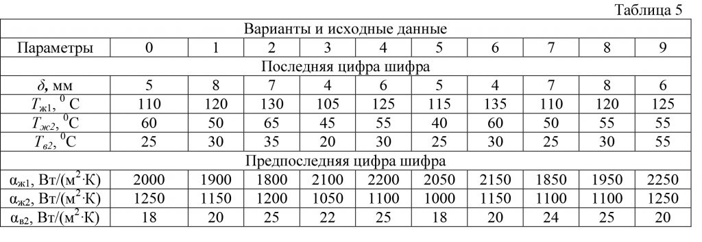 | Предпоследняя цифра шифра | d1, мм | δ2, мм | t1, ºC |