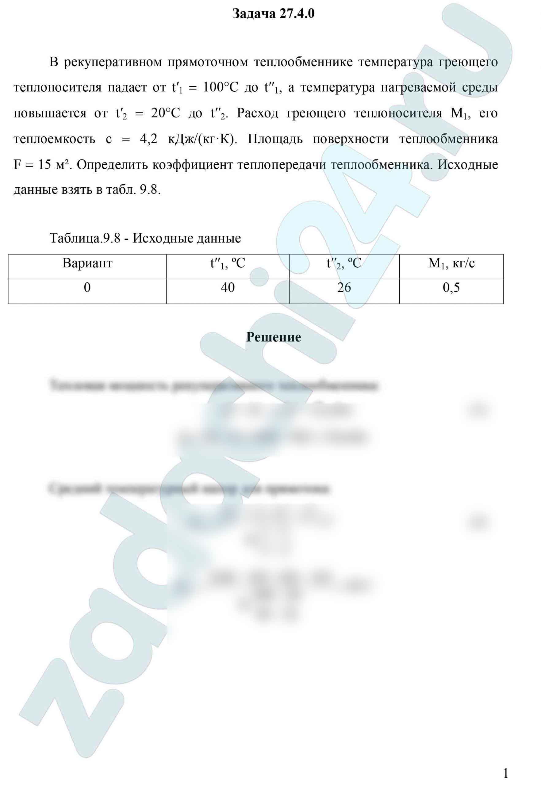 27.4 В рекуперативном прямоточном теплообменнике температура греющего теплоносителя падает от t′1 = 100°C до t′′1, а температура нагреваемой среды повышается от t′2 = 20°С до t′′2. Расход греющего теплоносителя М1, его теплоемкость с = 4,2 кДж/(кг·К). Площадь поверхности теплообменника F = 15 м². Определить коэффициент теплопередачи теплообменника. Исходные данные взять в табл. 9.8.