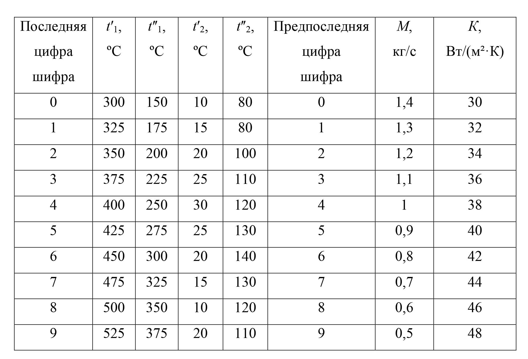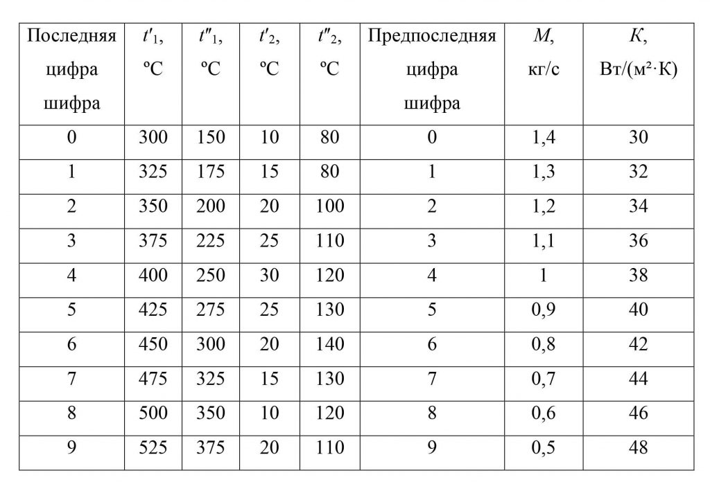 | Предпоследняя цифра шифра | t″1, ºC | t″2, ºC | G1, кг/c |