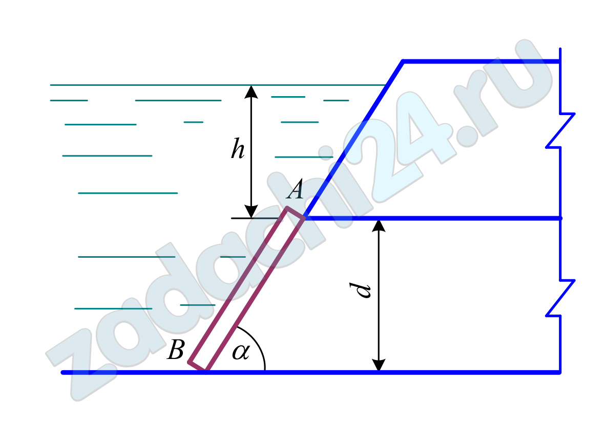 3.377 Определить силу давления Р на затвор АВ, найти центр давления, построить эпюру давления, если: АВ = 1,2 м, α = 60º, ρв = 1000 кг/м³.