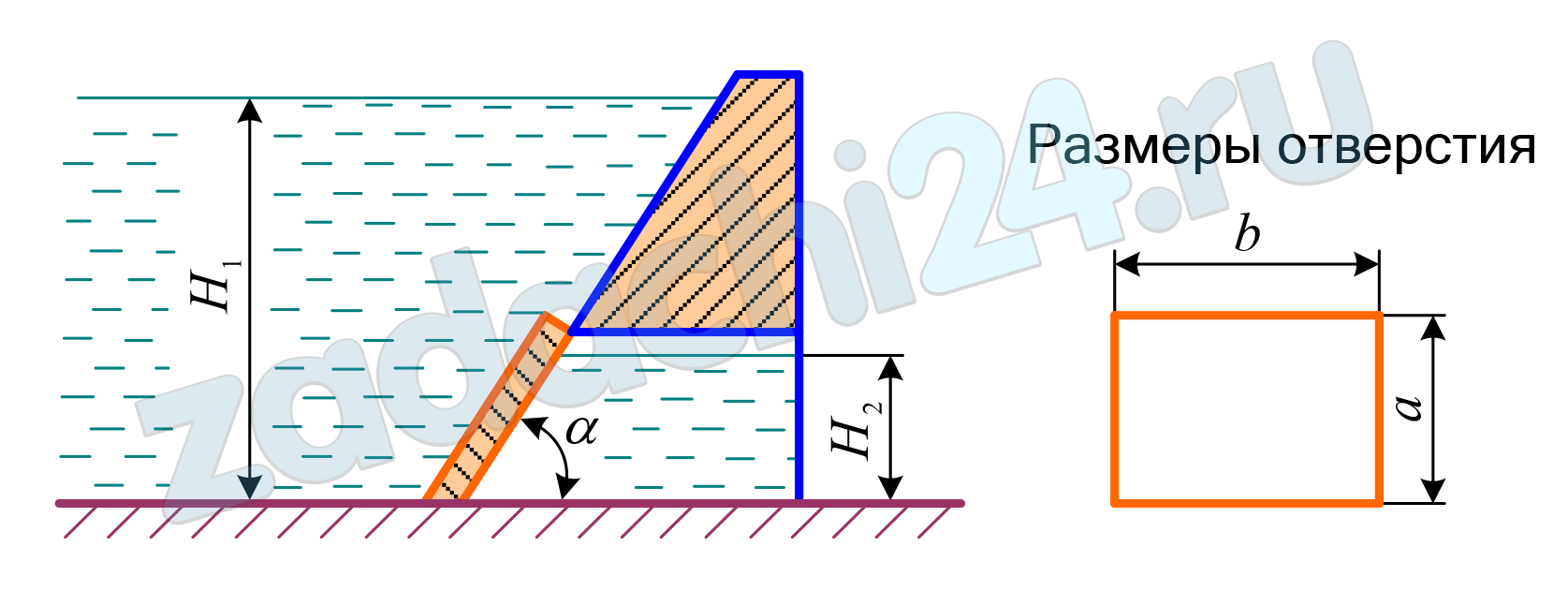 3.378 Определить равнодействующую силу давления Fр на затвор, закрывающий отверстие в плотине размерами (a×b) = (4×5) м и расположенный под углом α = 60º, если Н1 = 10 м и Н2 = 3 м. Найти координату Yg приложения силы давления слева на затвор.
