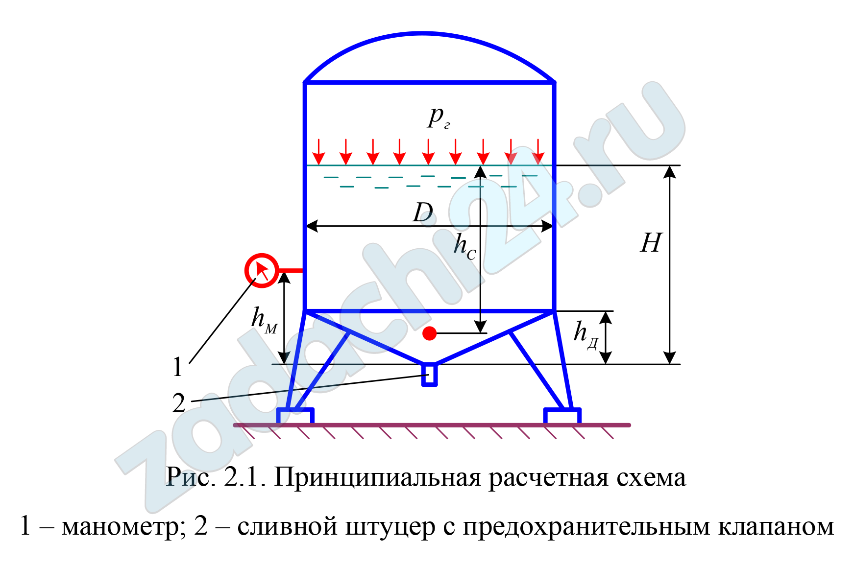Скачать файл (оплата в RUB)3.380 Герметично закрытая вертикально-цилиндрическая емкость частично заполнена жидкостью, над свободной поверхностью которой находится газ. на боковой стенке емкости установлен манометр. Емкость имеет коническое днище, в центре которого расположен сливной штуцер. Он снабжен предохранительным клапаном, срабатывающим при известном избыточном давлении. Используя исходные данные (таблица 2.1), определите уровень жидкости в емкости или ее диаметр, плотность жидкости, силу гидростатического давления на днище, а также избыточное давление газа, при котором сработает предохранительный клапан.