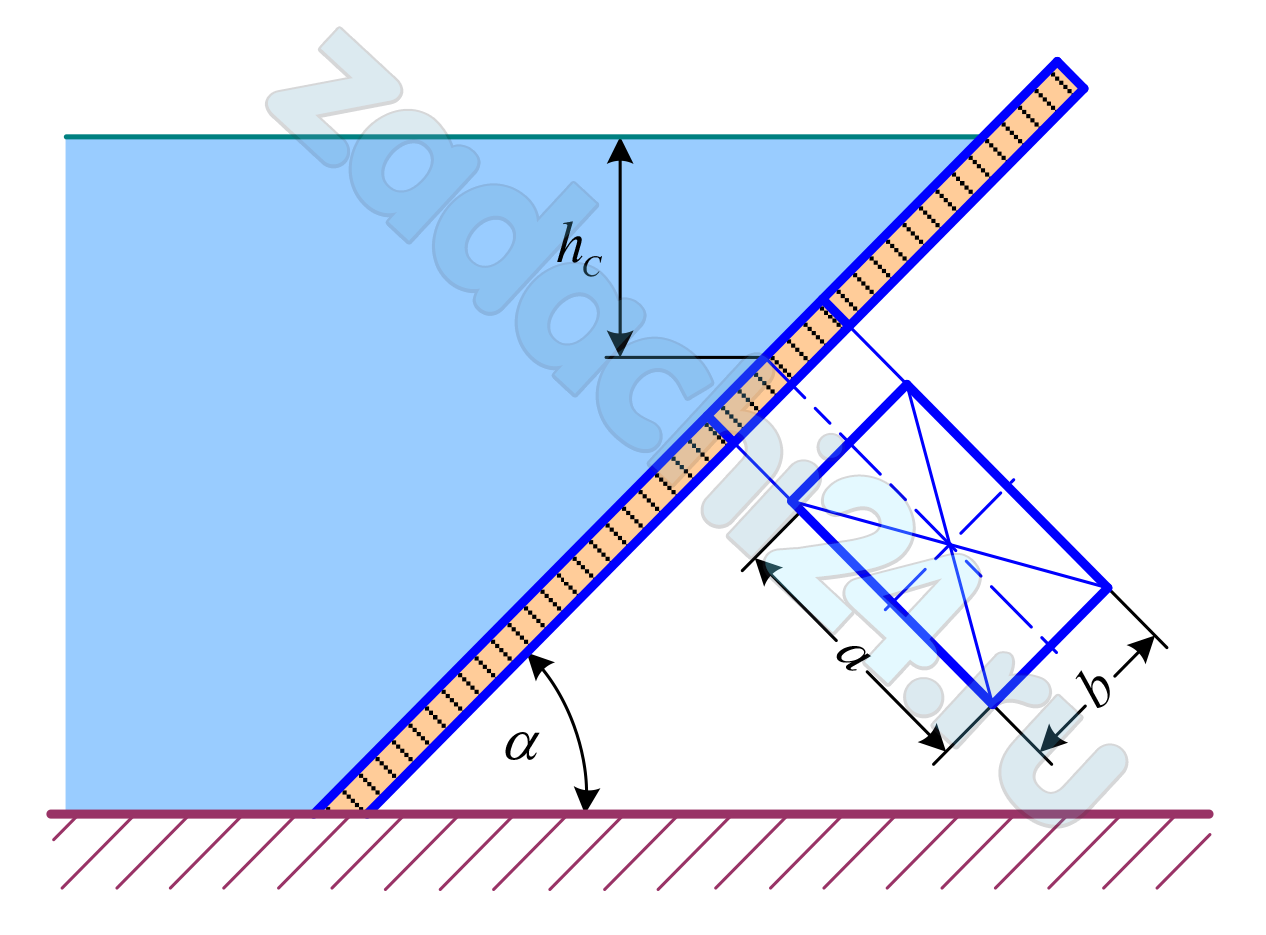 Скачать файл (оплата в RUB)3.387 Канал перегораживается плоским прямоугольным щитом (рис. 5.2). Глубина воды в канале h, угол наклона щита α. Шарнир находится на высоте a относительно дна канала. Плотность воды ρ = 1000 кг/м³.