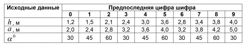 | № варианта | № рисунка | l, м | L, м | b, м | h, м | Н, м | α, º |