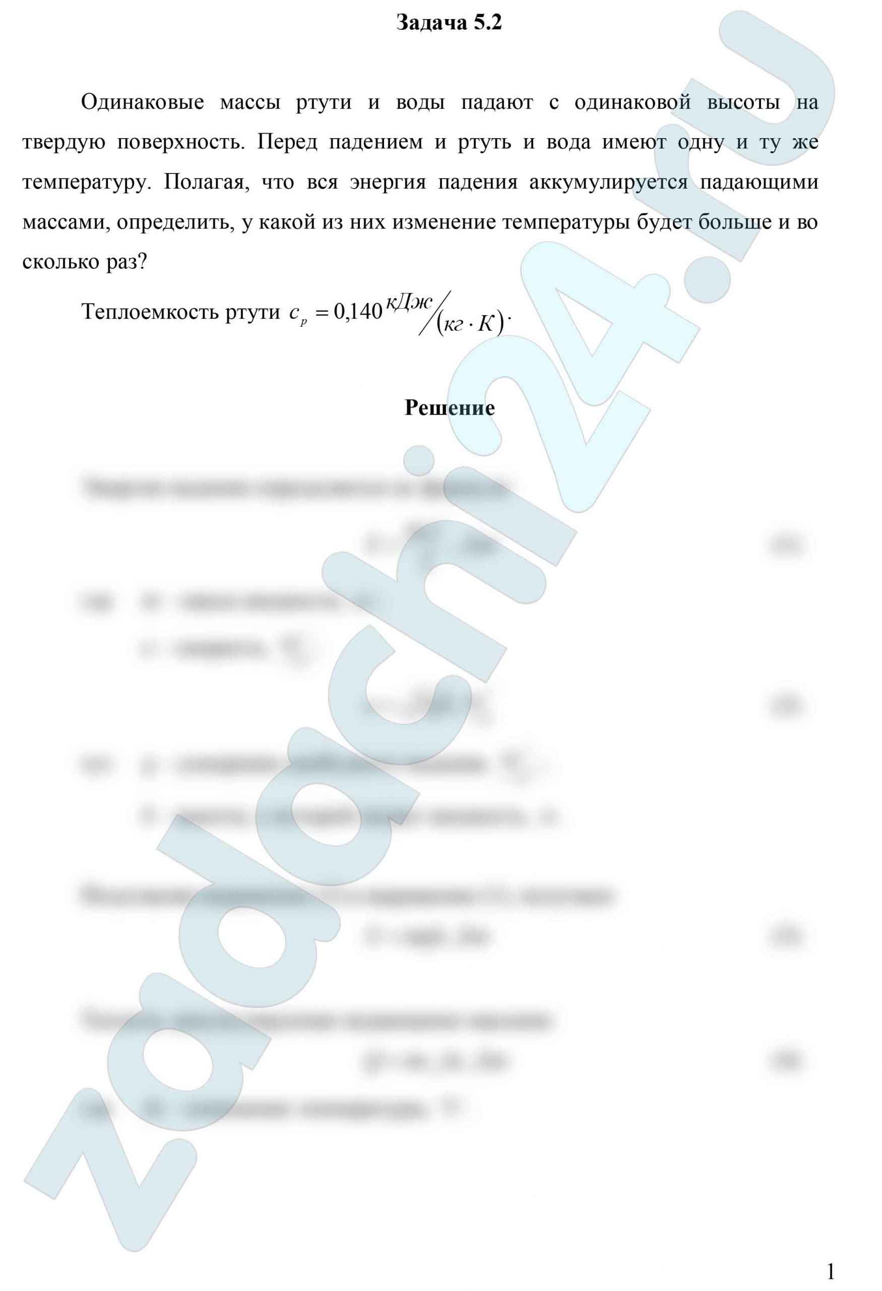 5.2 Одинаковые массы ртути и воды падают с одинаковой высоты на твердую поверхность. Перед падением и ртуть и вода имеют одну и ту же температуру. Полагая, что вся энергия падения аккумулируется падающими массами, определить, у какой из них изменение температуры будет больше и во сколько раз?