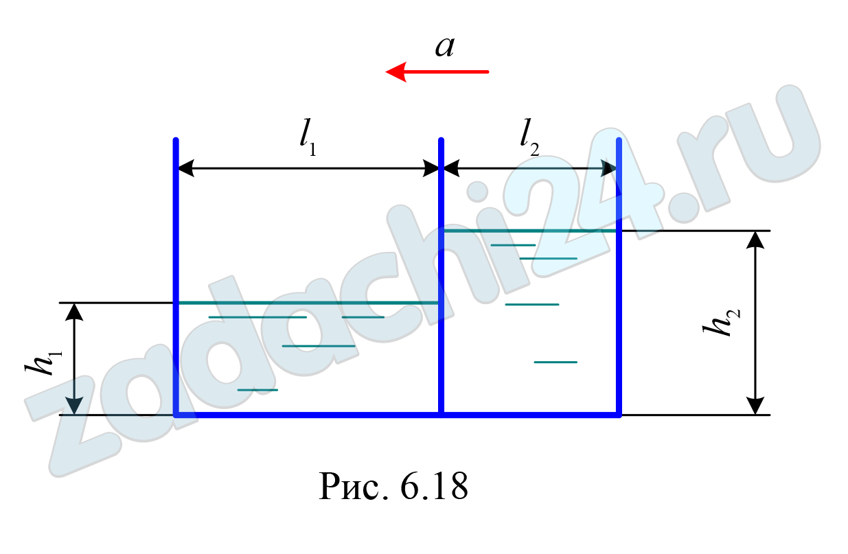 Скачать файл (оплата в RUB)6.59 Призматический сосуд, перемещающийся горизонтально с постоянным ускорением, разделен плоской перегородкой на два отсека, заполненных одинаковой жидкостью до высот h1 = 1,0 м и h2 = 1,5 м. Определить ускорение, при котором суммарная сила давления воды на перегородку равна нулю (рис. 6.18).