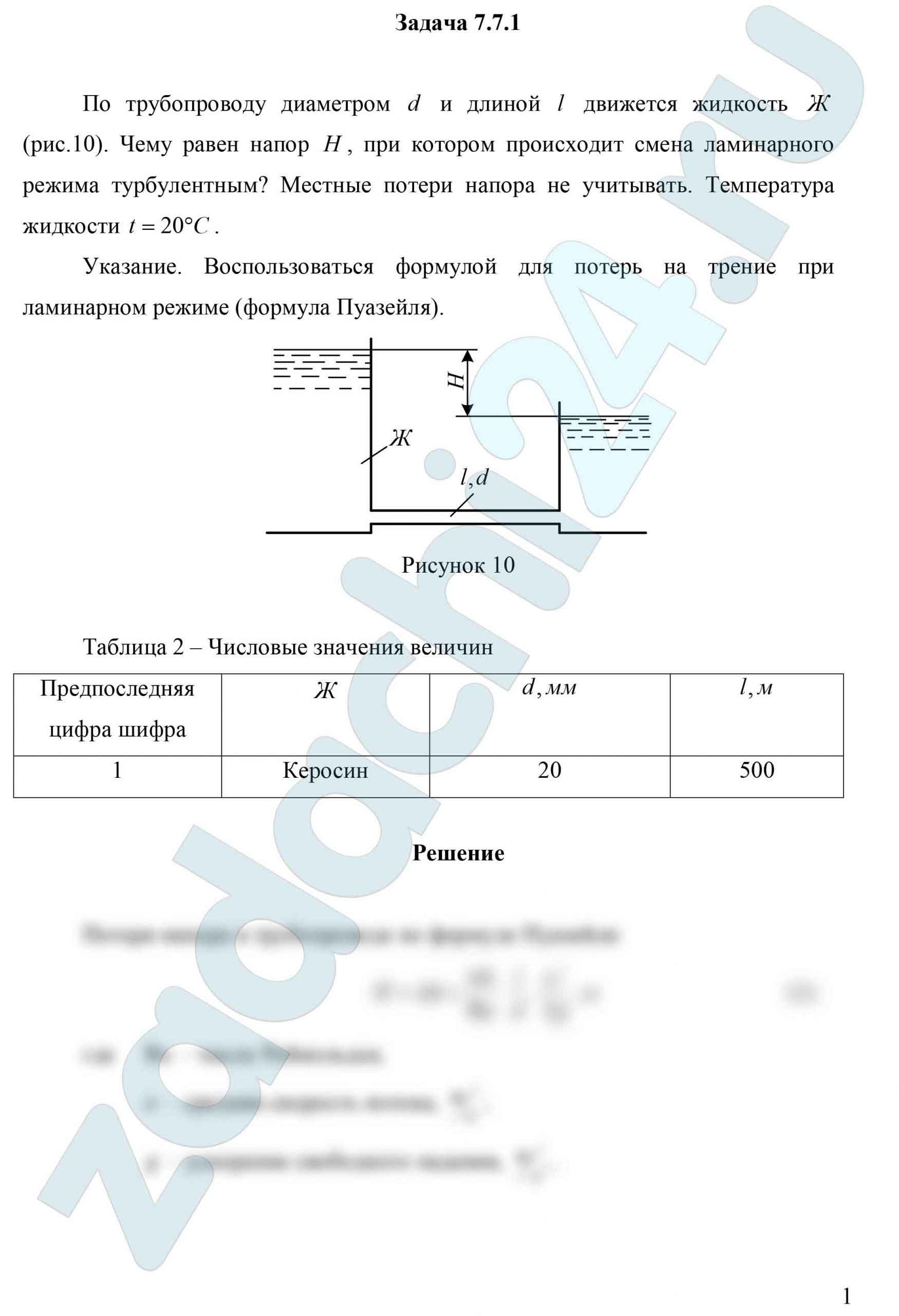 7.5 Определить диаметр трубопровода, по которому подаётся жидкость Ж с расходом Q, из условия получения в нём максимально возможной скорости при сохранения ламинарного режима. Температура жидкости t=20ºC.