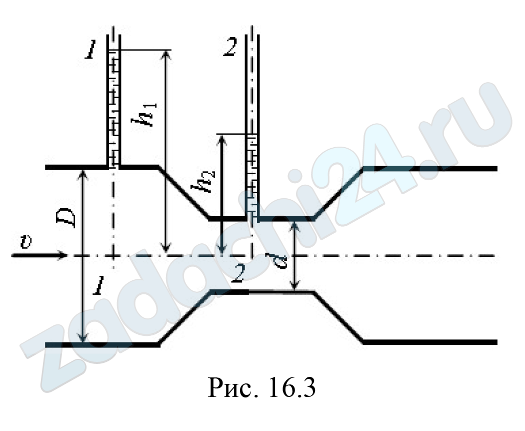7.378 Для определения расхода воды применяется пьезометрический водомер (рис. 16.3). Диаметр трубы D = 200 мм, диаметр суженного сечения d = 100 мм. Уровень жидкости в пьезометре 1 h1 = 1,0 м, уровень жидкости в пьезометре 2 h2 = 40 см. Определить: а) расход, приняв коэффициент расхода μ = 0,98; б) величину удельной кинетической энергии жидкости в сечениях 1 – 1 и 2 –2.