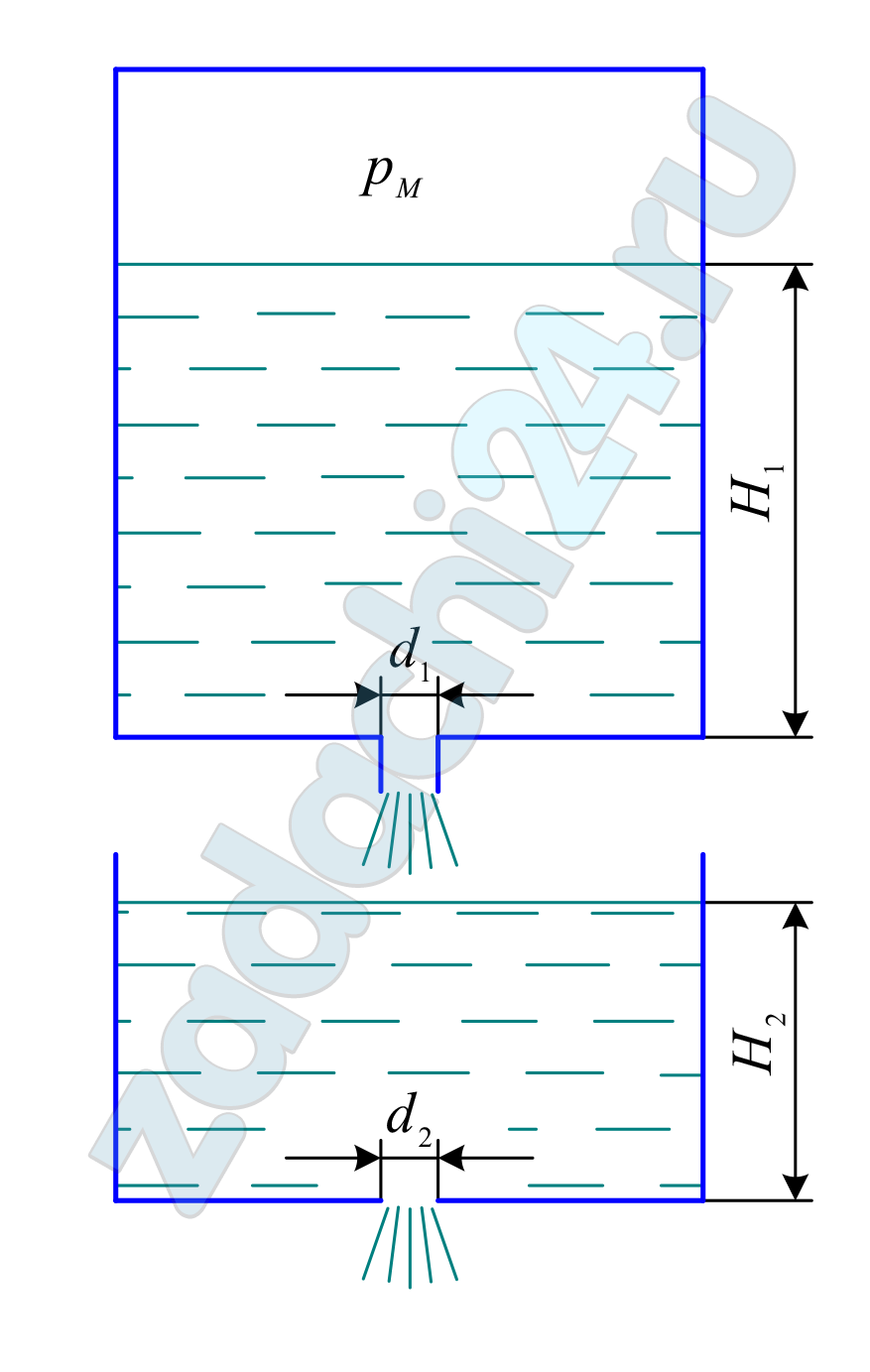 8.228 Нефть вытекает из верхней емкости диаметром D в нижнюю такого же диаметра через цилиндрический насадок, а из нижней емкости — через отверстие в тонкой стенке в атмосферу. Избыточное давление в верхней емкости рм, высота взлива Н1. Диаметр насадка d1, отверстия d2.