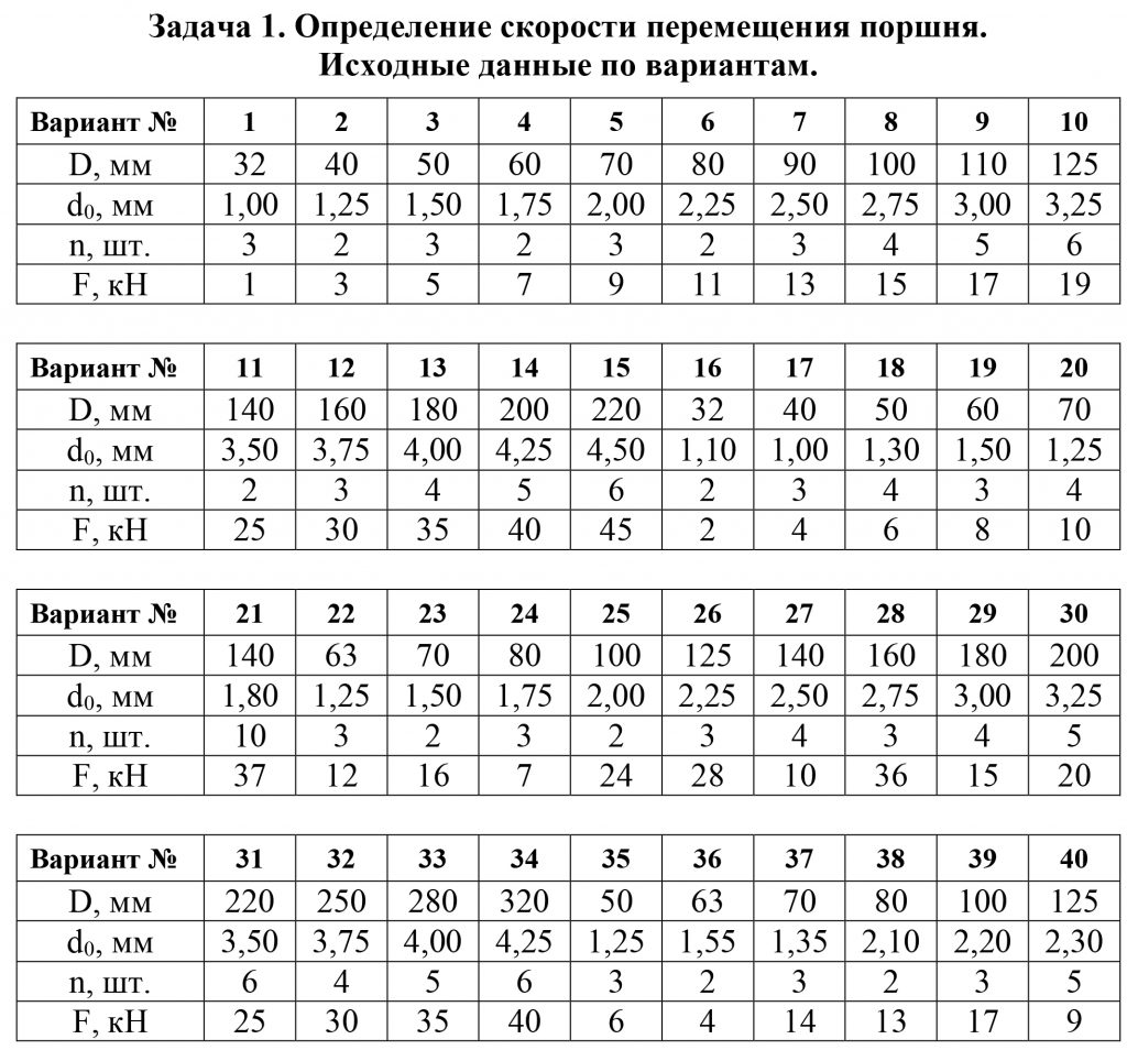 Поршень диаметром D имеет n отверстий диаметром d0 каждое (рис. 1.). К штоку приложена сила F. Требуется определить скорость перемещения поршня вниз. Отверстия рассматривать как внешние цилиндрические насадки. Плотность рабочей жидкости принять равной ρ = 900 кг/м³.
