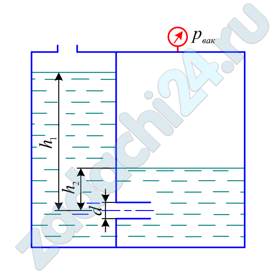 8.232 Бензин перетекает из открытого левого бака в закрытый правый через цилиндрический насадок диаметром d. Вакуумметрическое давление в правом баке равно рвак. Уровень бензина в баках h1 и h2.