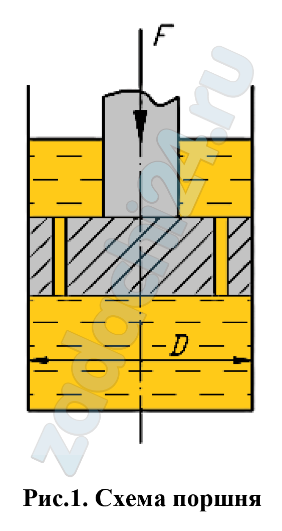 Поршень диаметром D имеет n отверстий диаметром d0 каждое (рис. 1.). К штоку приложена сила F. Требуется определить скорость перемещения поршня вниз. Отверстия рассматривать как внешние цилиндрические насадки. Плотность рабочей жидкости принять равной ρ = 900 кг/м³.