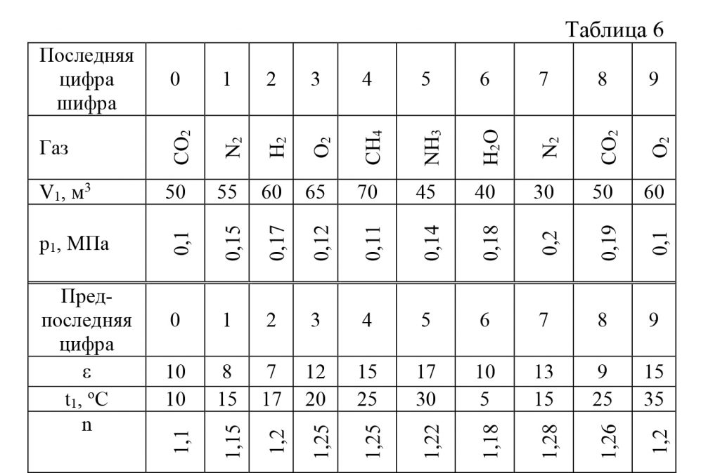 19.67 V1, м³ газа с начальным давлением р1 и начальной температурой t1 сжимается до изменения объема в ε раз (ε=V1/V2).