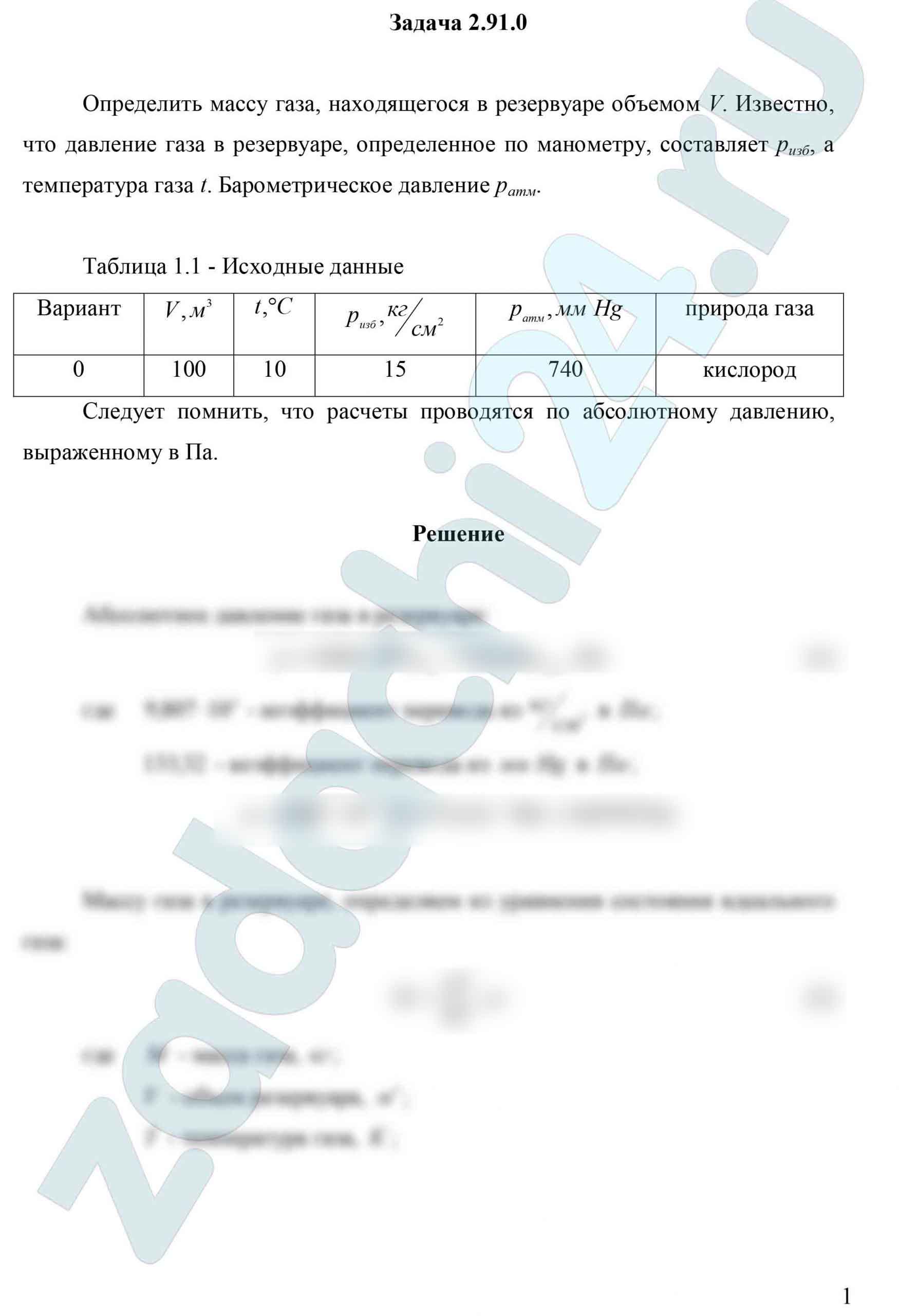 2.91 Определить массу газа, находящегося в резервуаре объемом V. Известно, что давление газа в резервуаре, определенное по манометру, составляет pизб, а температура газа t. Барометрическое давление pатм.