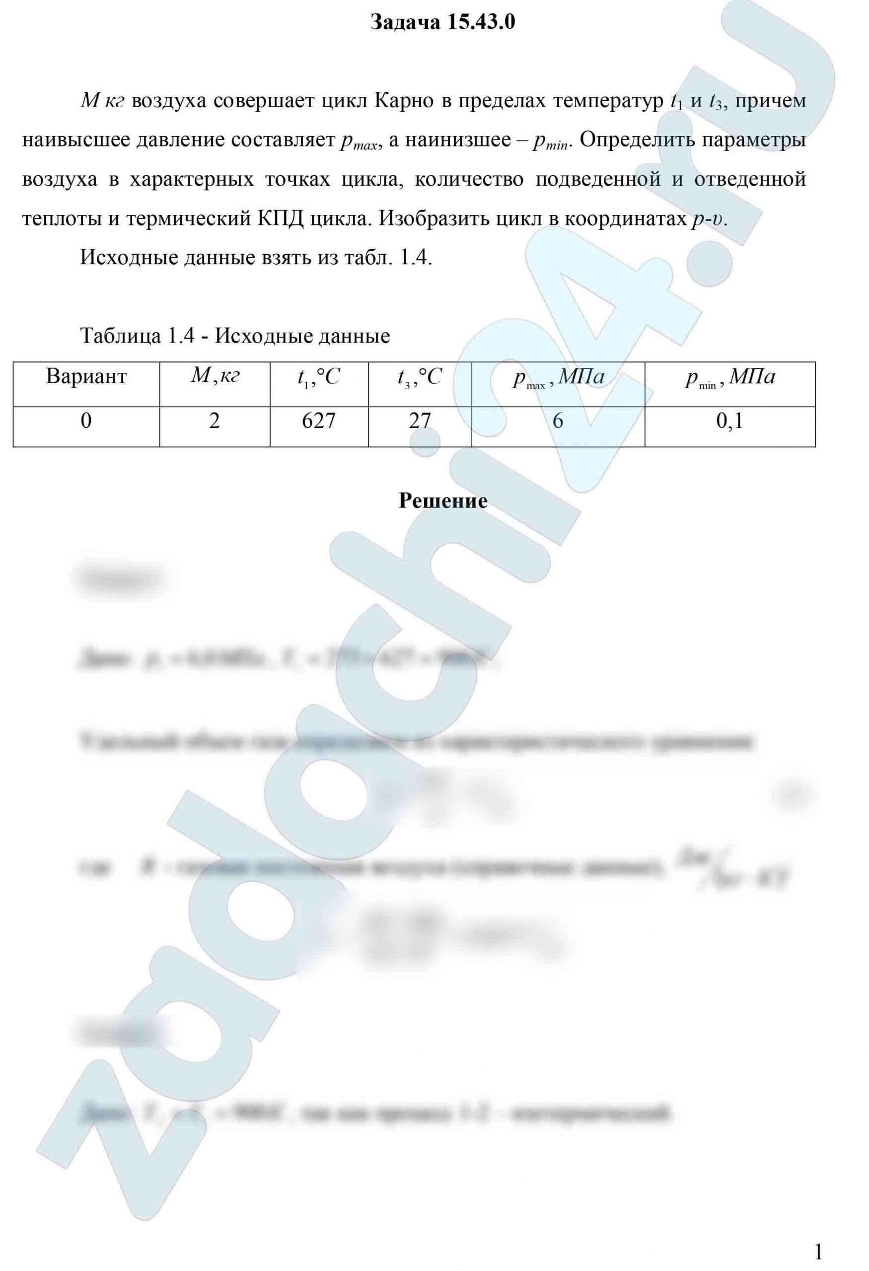 15.43 М кг воздуха совершает цикл Карно в пределах температур t1 и t3, причем наивысшее давление составляет pmax, а наинизшее – pmin. Определить параметры воздуха в характерных точках цикла, количество подведенной и отведенной теплоты и термический КПД цикла. Изобразить цикл в координатах p-υ.