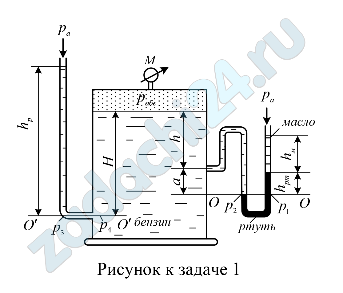 Определить показание пружинного манометра (обозначение буквой М), установленного на крышке резервуара и абсолютное давление рабс паров на поверхности бензина, а также возможную высоту уровня бензина в пьезометре hр при условии, что известны: высота h от места установки манометра до свободной поверхности бензина; высота а от места установки манометра до плоскости уровня 0-0 и высота Н от плоскости уровня 0‘-0‘ до места установки пьезометра; принять плотность ртути ρрт = 13,6⸱10³ кг/м³; плотность масла ρмас = 820 кг/м³; атмосферное давление ра = 98 кПа.