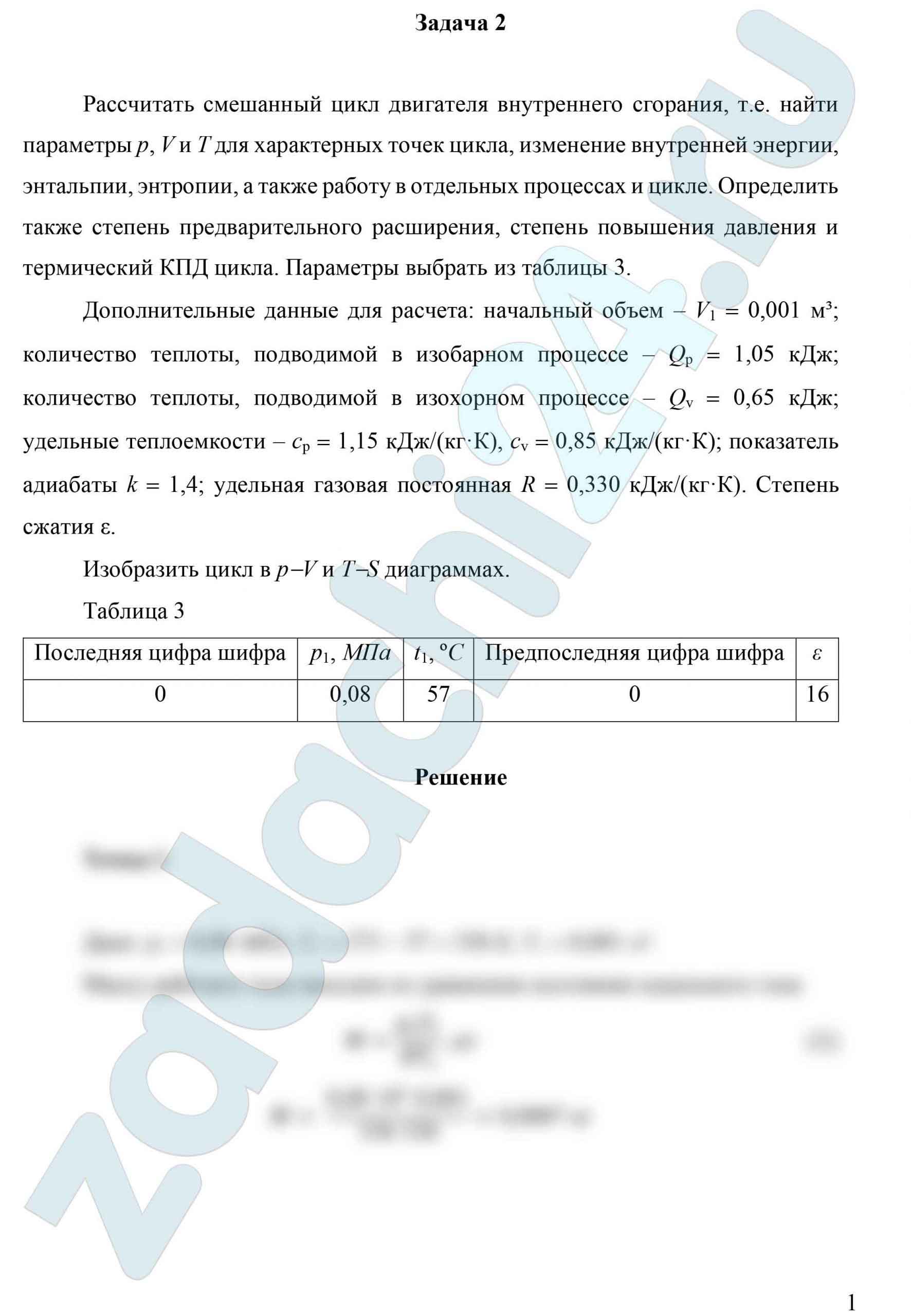 16.18 Рассчитать смешанный цикл двигателя внутреннего сгорания, т.е. найти параметры p, V и T для характерных точек цикла, изменение внутренней энергии, энтальпии, энтропии, а также работу в отдельных процессах и цикле. Определить также степень предварительного расширения, степень повышения давления и термический КПД цикла. Параметры выбрать из таблицы 1.