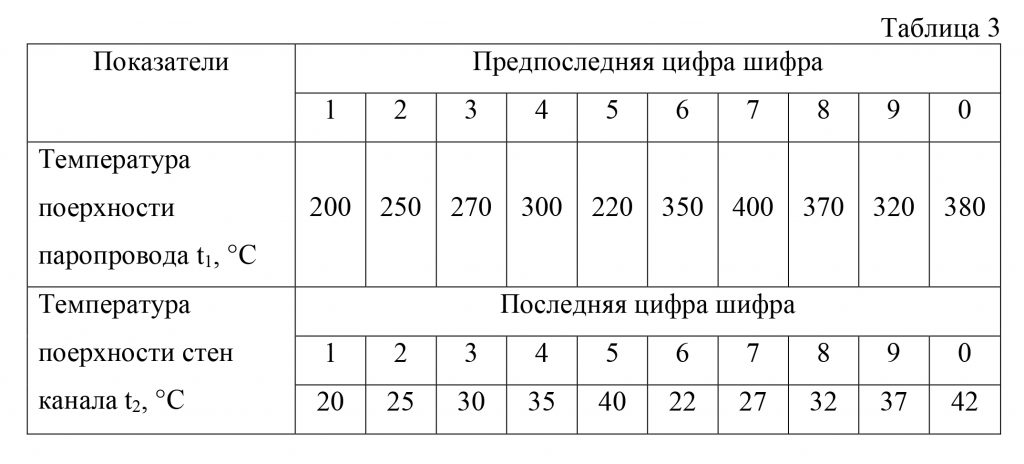 25.65 Определить потерю теплоты одним погонным метром стального паропровода с наружным диаметром 100 мм в результате лучистого теплообмена. Паропровод расположен в кирпичном канале, имеющем поперечное сечение 300×300 мм. Температуру наружной поверхности паропровода t1 и внутренней поверхности стенок канала t2 принять из табл. 3. Степень черноты окисленной стали и красного кирпича см. в. приложении 1.