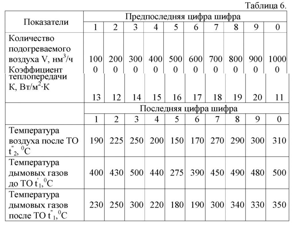 27.72 Определить поверхность нагрева рекуперативного теплообменника (ТО), в котором происходит нагрев воздуха дымовыми газами, при прямоточной и противоточной схемах включения теплоносителей. Температуру воздуха, поступающего в ТО, принять t′2=30 ºC. Количество подогреваемого воздуха V и коэффициент теплопередачи от дымовых газов к воздуху K взять из табл. 6. Температуру воздуха на выходе из ТО — t″2, температуру дымовых газов на входе в ТО — t′1 и температуру дымовых газов на выходе из ТО — t″1 взять из табл. 6.