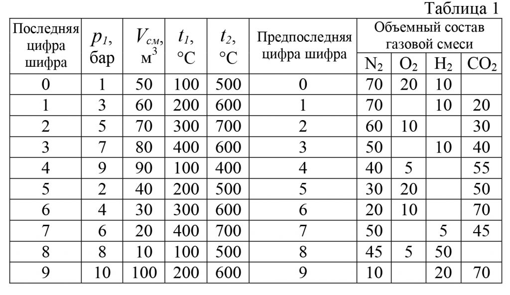 Найти также средние массовые теплоемкости этой смеси при постоянном давлении р1 в интервале температур от t1 до t2 и определить количество теплоты для изобарного нагревания m кг газовой смеси от t1 до t2, если задан общий начальный объем этой смеси Vсм.
