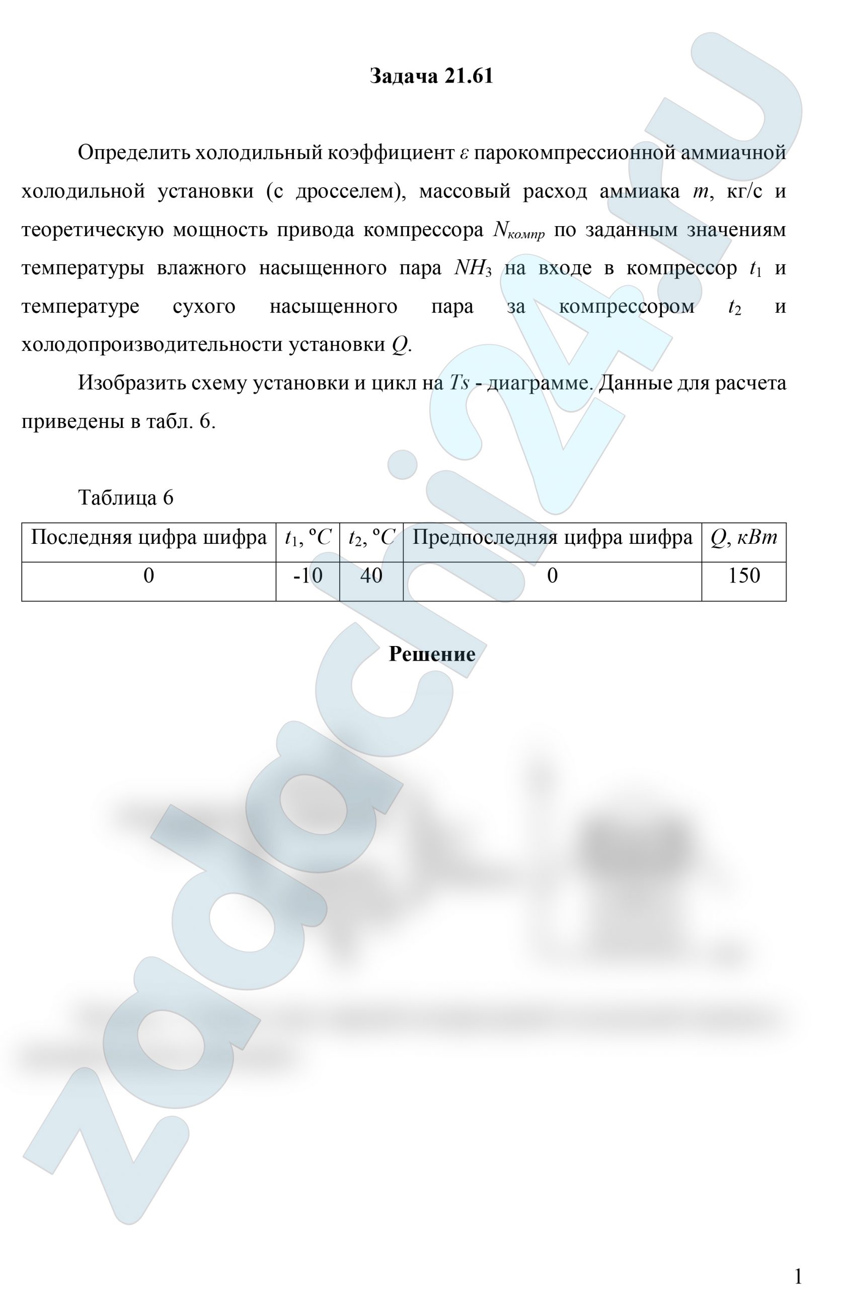 21.61 Определить холодильный коэффициент ε парокомпрессионной аммиачной холодильной установки (с дросселем), массовый расход аммиака m, кг/c и теоретическую мощность привода компрессора Nкомпр по заданным значениям температуры влажного насыщенного пара NH3 на входе в компрессор t1 и температуре сухого насыщенного пара за компрессором t2 и холодопроизводительности установки Q.