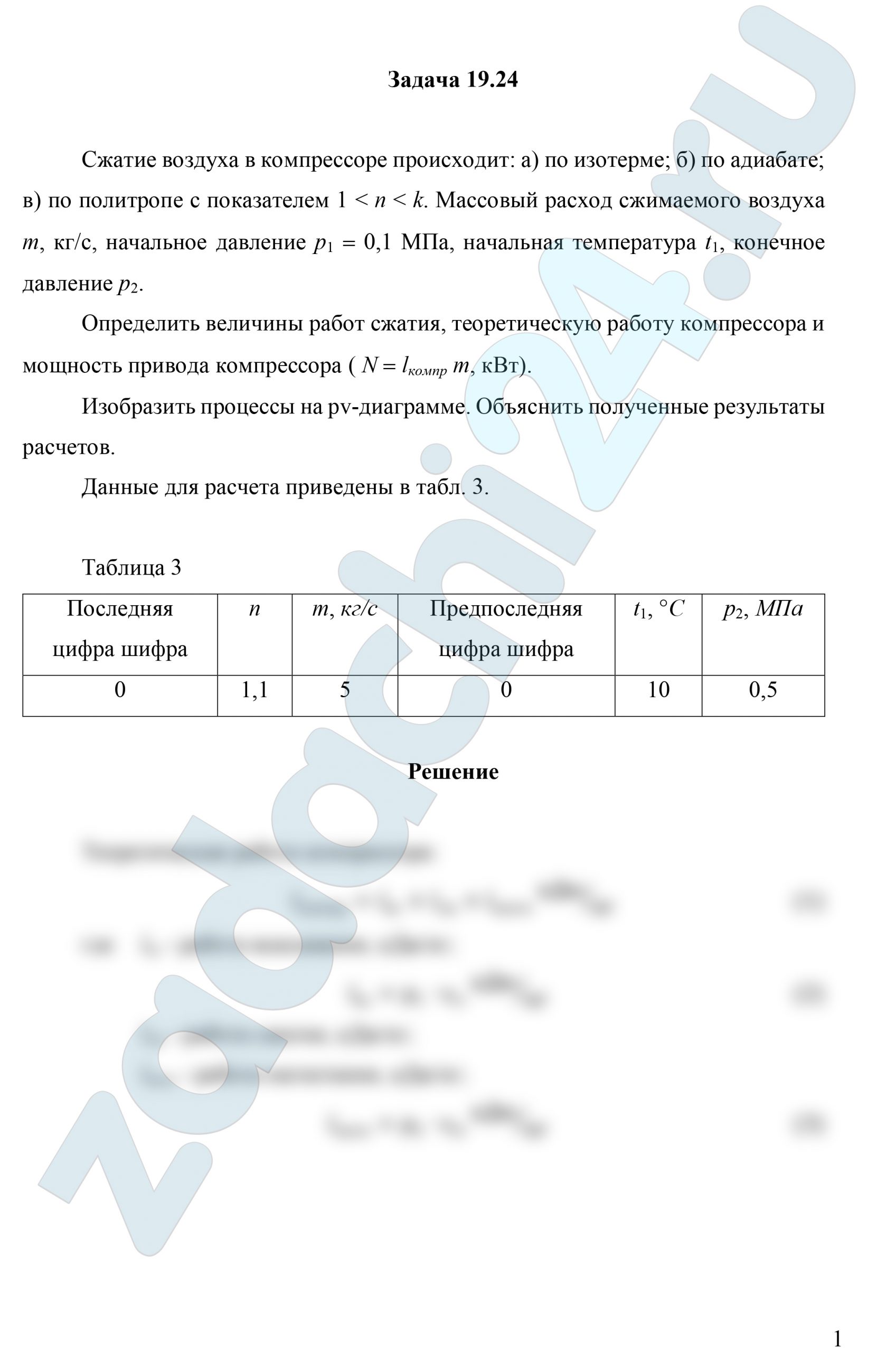 19.24 Сжатие воздуха в компрессоре происходит: а) по изотерме; б) по адиабате; в) по политропе с показателем 1 < n < k. Массовый расход сжимаемого воздуха m, кг/c, начальное давление р1 = 0,1 МПа, начальная температура t1, конечное давление р2.